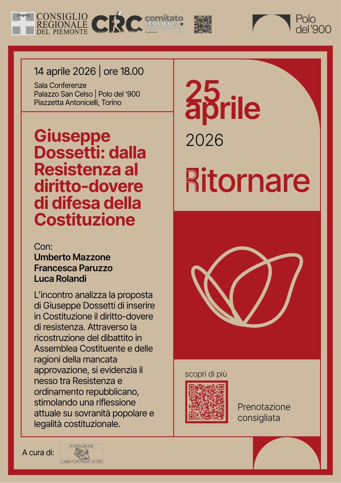 L’incontro su Dossetti si inserisce nel progetto 25 aprile 2026: Ritornare, promosso dalla Fondazione Polo del ’900 con la collaborazione di tutti e 26 gli enti partner. Dopo aver seguito negli scorsi anni gli eventi legati agli 80 anni della guerra di resistenza (1943-1945), quest’anno le attività del Polo del ’900 si concentrano sul tema del ritorno: su cosa accadde tra aprile 1945 e aprile 1946.